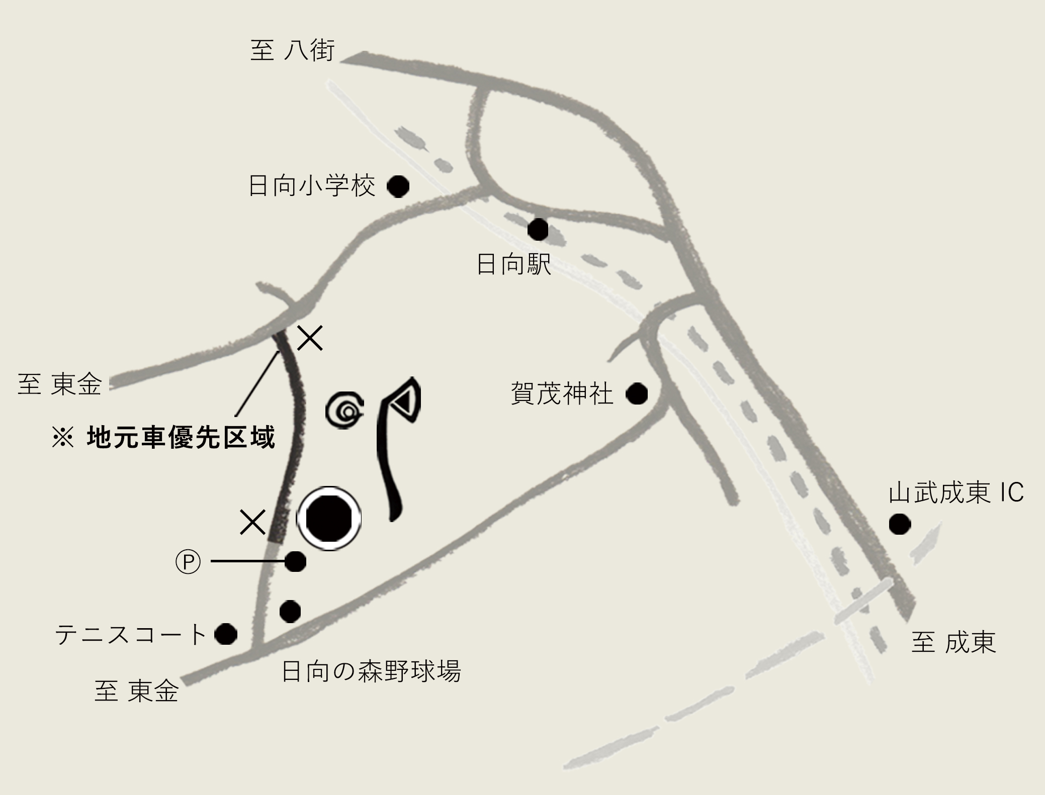 日向の森を目指してこちらを参考にお越しください。 会場前の通りは一部道幅が狭く、擦れ違い困難な箇所がございます。