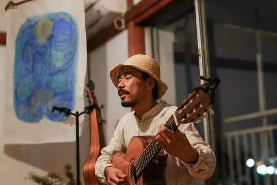 10数年に及ぶ世界放浪生活、自己探究の旅を経て、香川県の荘内半島に在住。Liveでは自作の歌やOld Folk、Jazzや民謡などの楽曲を演奏し、時にはフィールドレコーディングとの即興演奏も行い、聴いている人の心の内に旅をしているような、様々な心象風景をいまここに映し描く。全国各地、多種多様なフィールドへと歌旅を彼此十五年位マイペースに続けている